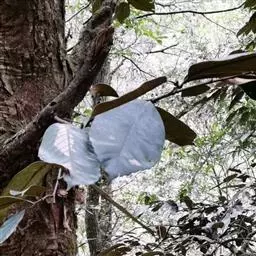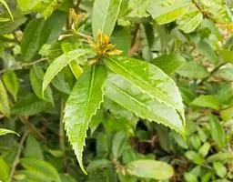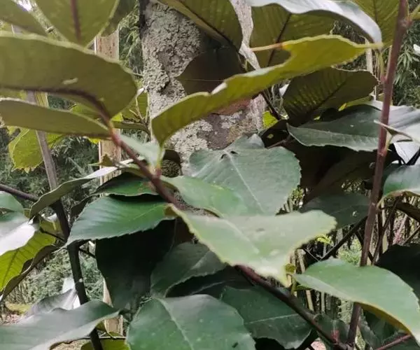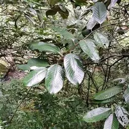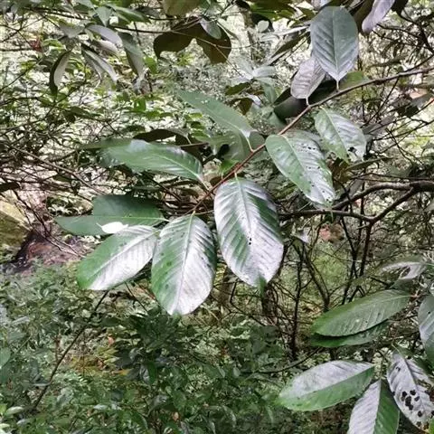 新生嫩叶暗紫褐色,成长叶革质,卵状椭圆形,卵形,长椭圆形或倒卵状椭圆形,长15-30厘米,宽5-10厘米,顶部渐尖,短突尖或尾状,基部近于圆或短楔尖,对称或有时一侧略短且偏斜,叶缘至少在近顶部有锯齿状锐齿,侧脉直达齿端,中脉在叶面凹陷,侧脉每边15-18条,网状脉明显,叶背红褐色(新生叶)、淡棕灰或银灰色(老叶);叶柄长1.5-3厘米。