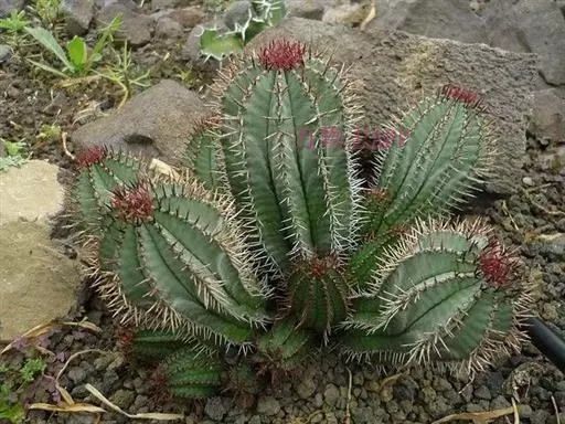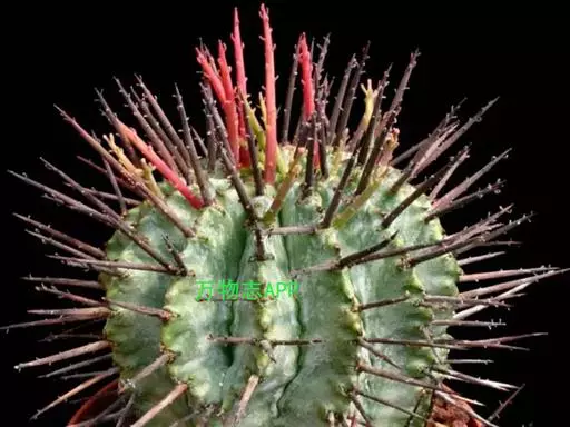 魁伟玉原产南非,是一种大戟科的多年生肉质植物,植株具粗圆筒形肉质茎,有10条以上的突出棱,表皮绿色至灰绿色,披有白粉,有较为明显、平行排列的深色横肋,刺生于棱缘上,红褐至深褐色,易脱落。小叶早脱落,因此给人的印象是植株始终无叶。聚伞花序,小花紫红色,但盆栽条件下不易开花。魁伟玉形态奇特,酷似某些品种的仙人掌类植物,用工艺盆栽种点缀几案、书架和窗台等处,古朴自然,如同有生命的工艺品。