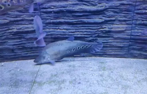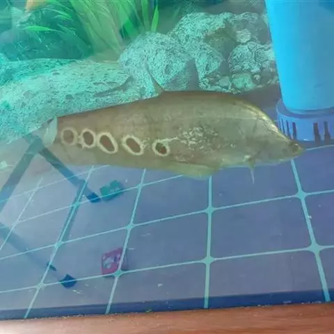 七星刀鱼,学 名Notopterus chitala,又 名鲍孔驼背鱼、七星飞刀、东洋刀、花刀鱼,英文名Clown Knife Fish,原产地泰国、缅甸、印度,体 长70~90cm,适宜水22~28℃,弓背鱼体形特别,背似弓形隆起, 前半身体幅很宽,背鳍之后变窄,至尾 鳍呈尖刀形,微凹上翘。体色为银灰褐 色,由鳃盖后方至尾部并排了几个镶白 边的黑色圆斑。头部尖小,口角无须。背 鳍小,臀鳍和尾鳍相连成一体。腹鳍常 无或发育不完全。幼鱼没有斑点,只有 10~15条淡淡斜纹,成鱼后才变成圆形斑点,并且头部背方突出隆起