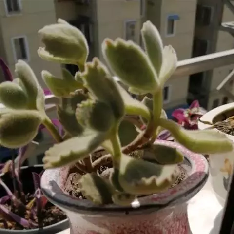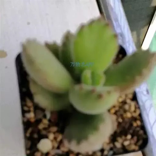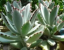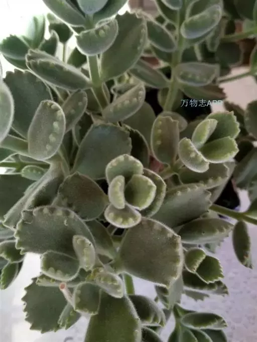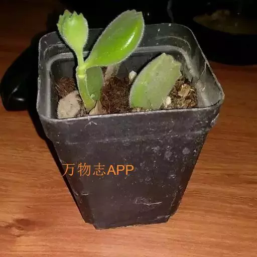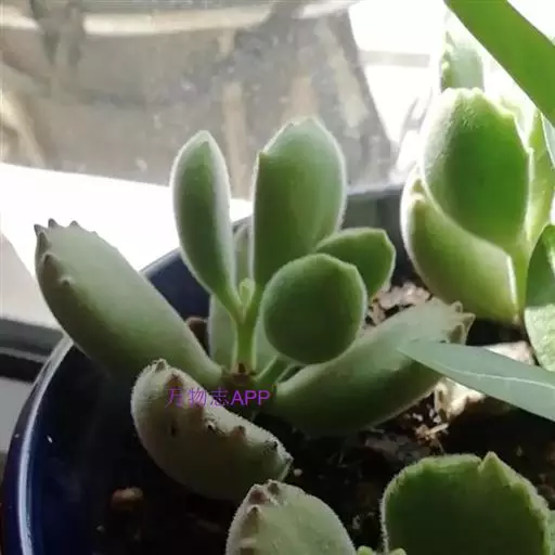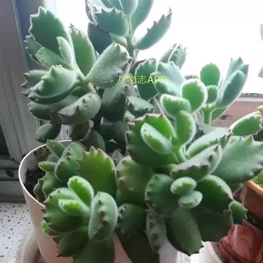 叶片肥厚肉质,倒披针形至长卵圆形,扁匙状,交互对生,长2.3-6.5厘米,宽1.5-3.2厘米;叶表绿色,表面密被白色极细短绒毛,叶端具缺刻,前1/3部分具红色爪样齿,形似熊掌。