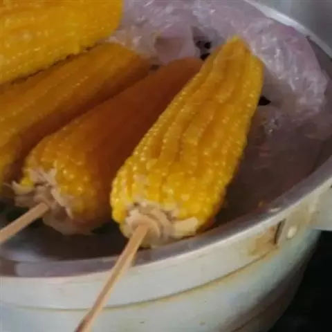 (4)将烤网洗净放在碳火上,放入由竹筷固定好的玉米,先烤三分熟后,再涂上调味料B,继续烤,并须翻动玉米,以能让玉米能入味,烤至熟透并微焦香,即可食用。 玉米可以撒上芝麻或起司烤,味道也很好。