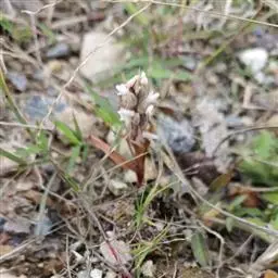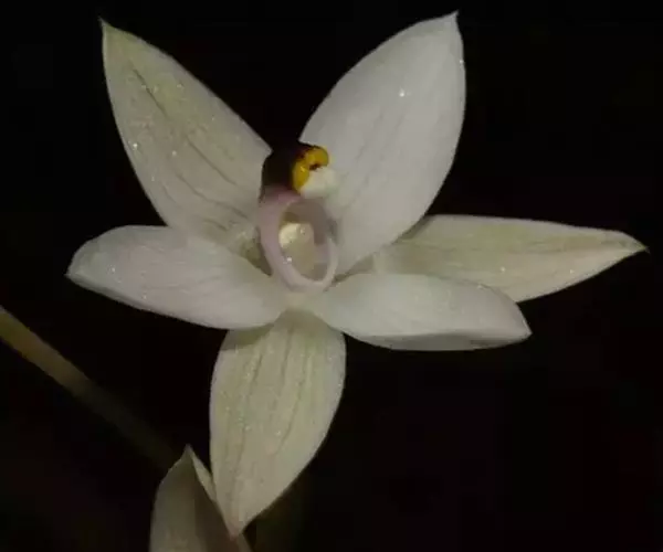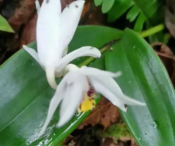 足茎毛兰(学名:Eria coronaria (Lindl.) Rchb. f.):植物体无毛,干后全体变黑,具根状茎;根状茎上常有漏斗状革质鞘,假鳞茎密集或每隔1-2厘米着生,不膨大,圆柱形。叶2枚着生于假鳞茎顶端,1大1小,长椭圆形或倒卵状椭圆。花序1个,自两叶片之间发出,具2-6朵花;花白色,唇瓣上有紫色斑纹;花瓣长圆状披针形,与中萼片近等长,宽约4.5毫米,先端钝;唇瓣轮廓长圆形,长14-15毫米,宽11-12毫米,3裂。蒴果倒卵状圆柱形,长约2厘米;果柄长约3毫米。花期5-6月。