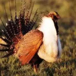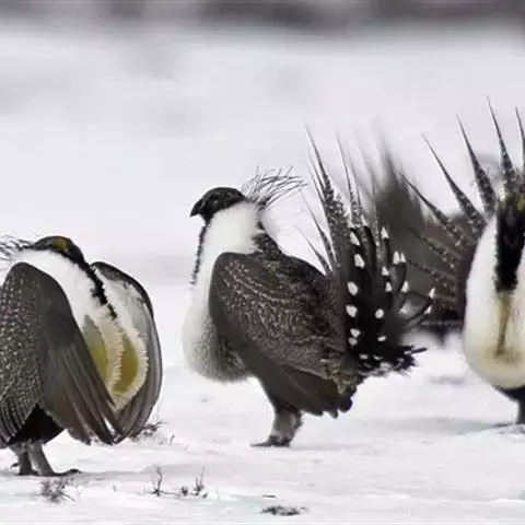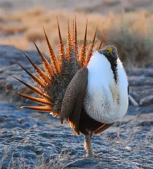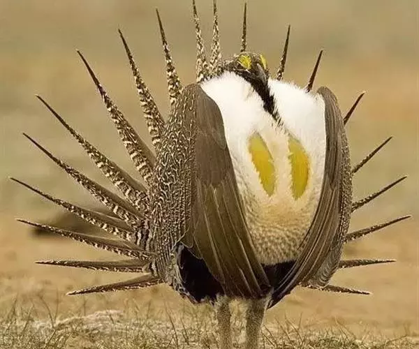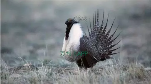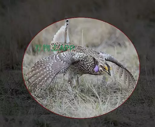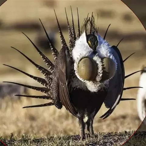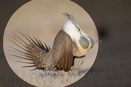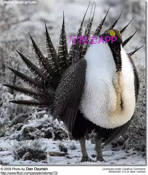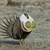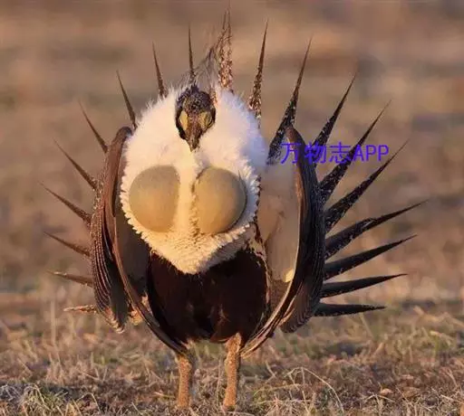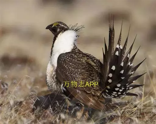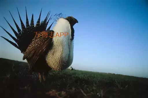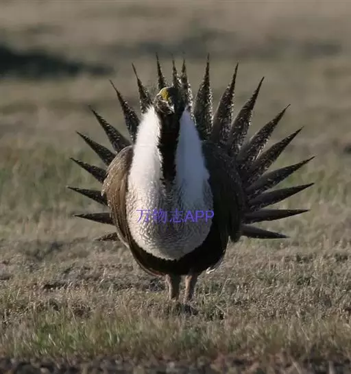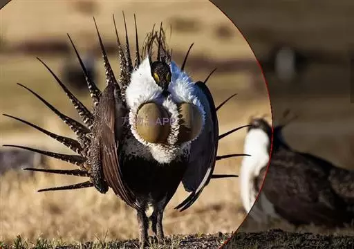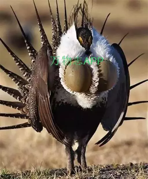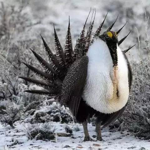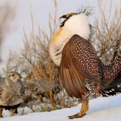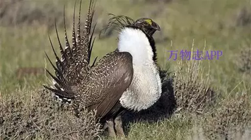 艾草松鸡(学名:Centrocercus urophasianus):是北美洲最大的松鸡。身高48-76厘米,体重2300-3200克。雄性大于雌性,更重。雄性长着两个大胸,雌性却没有胸。 颈上有两个黄色的囊,可以在求偶时充气以吸引异性。走禽,体结实,喙短,呈圆锥形,适于啄食植物种子;翼短圆,不善飞;脚强健,具锐爪,善于行走和掘地寻食。雄鸟具大的肉冠和美丽鲜艳的羽毛,早成鸟,鼻孔和脚均有被羽,以适应严寒。