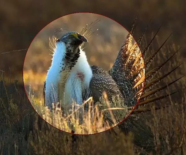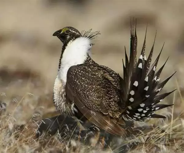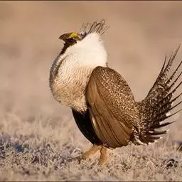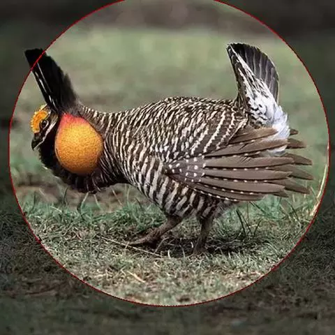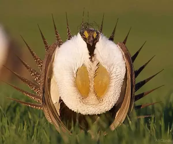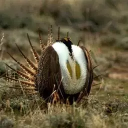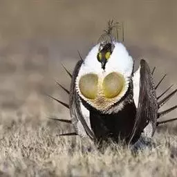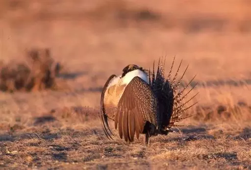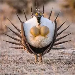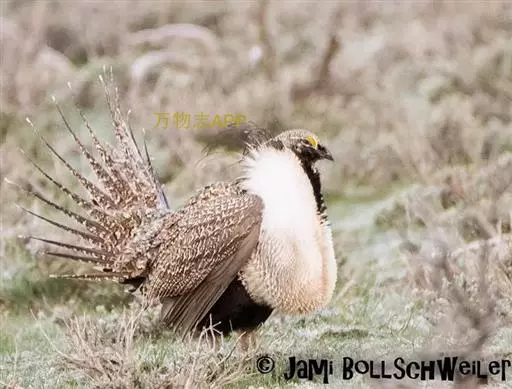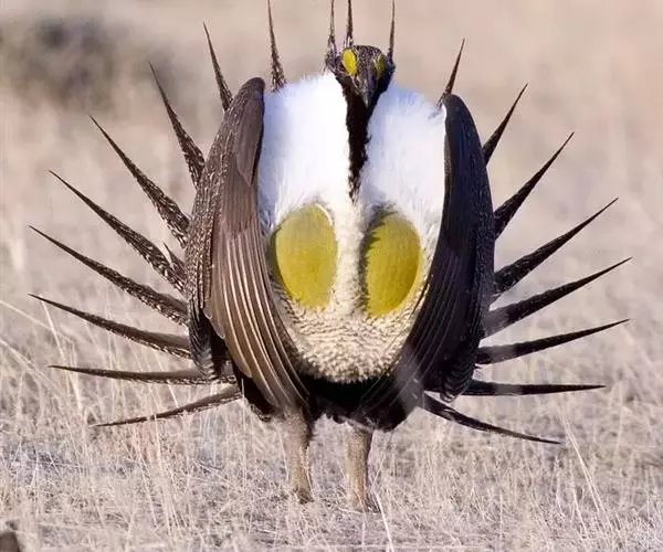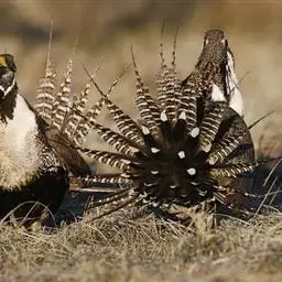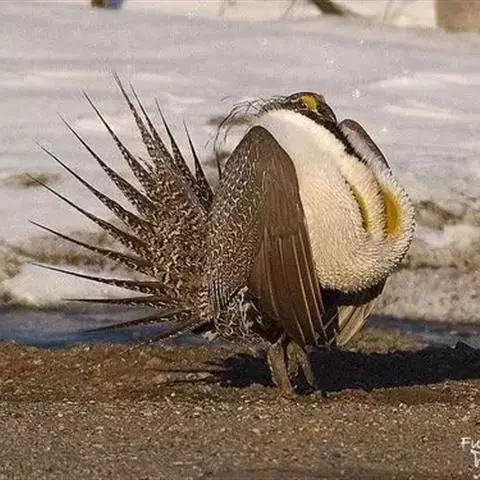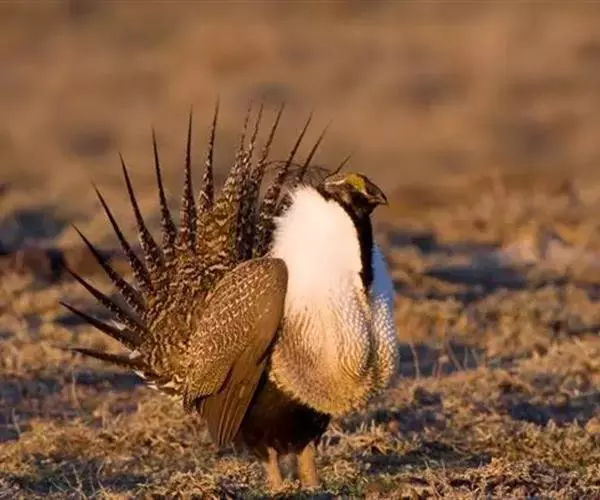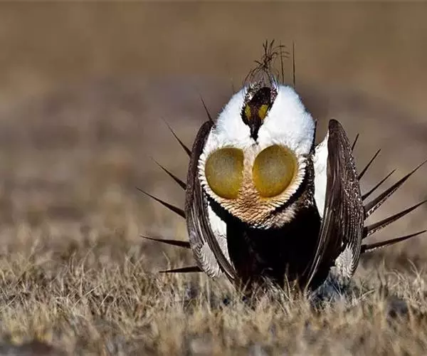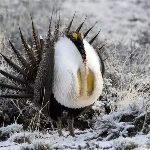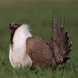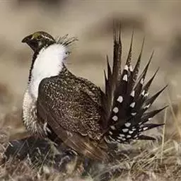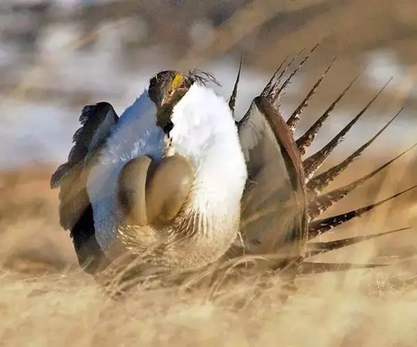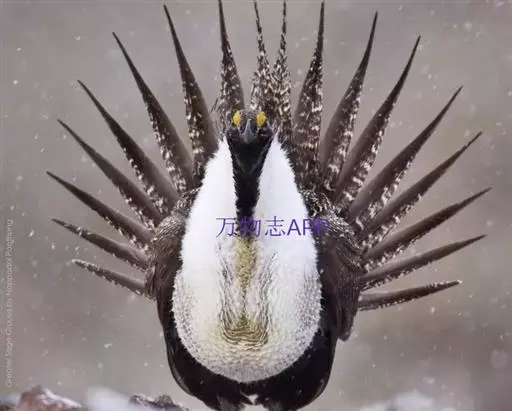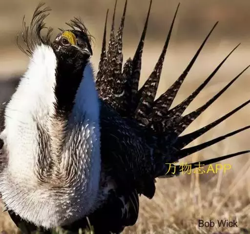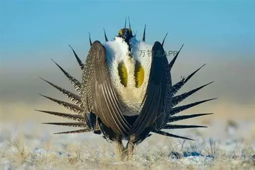 艾草松鸡(学名:Centrocercus urophasianus):是北美洲最大的松鸡。身高48-76厘米,体重2300-3200克。雄性大于雌性,更重。雄性长着两个大胸,雌性却没有胸。 颈上有两个黄色的囊,可以在求偶时充气以吸引异性。走禽,体结实,喙短,呈圆锥形,适于啄食植物种子;翼短圆,不善飞;脚强健,具锐爪,善于行走和掘地寻食。雄鸟具大的肉冠和美丽鲜艳的羽毛,早成鸟,鼻孔和脚均有被羽,以适应严寒。