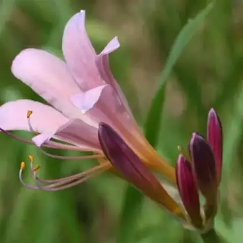 紫根兰,石蒜科垂筒花属,多年生球茎草本。别名乔治百合。喜温暖湿润气候,生长适温为18—25℃,忌酷热,阳光不宜过于强烈,应置荫棚下养护。怕水涝。冬季休眠期,要求冷凉的气候,以10一12℃为宜,不得低于5℃。喜富含腐殖质、排水良好的砂壤土。