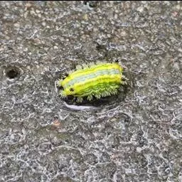 中国绿刺蛾幼虫 成虫长约12毫米,翅展21~28毫米;头胸背面绿色,腹背灰褐色,末端灰黄色;触角雄羽状、雌丝状;前翅绿色,基斑和外缘带暗灰褐色;后翅灰褐色,臀角稍灰黄。卵扁平椭圆形,长1.5毫米,光滑,初淡黄,后变淡黄绿色。幼虫体长16~20毫米;头小,棕褐色,缩在前胸下面;体黄绿色,前胸盾具1对黑点,背线红色,两侧具蓝绿色点线及黄色宽边,侧线灰黄色较宽,具绿色细边;各节生灰黄色肉质刺瘤l对,以中后胸和8~9腹节的较大,端部黑色,第9、10节上具较大黑瘤2对;气门上线绿色,气门线黄色;各节体侧也有1对黄色刺瘤,端部黄褐色,上生黄黑刺毛;腹面色较浅。蛹长13~15毫米,短粗;初产淡黄,后变黄褐色。茧扁椭圆形,暗褐色。