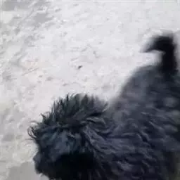 头部有丝绸般柔软的头髻,头盖窄似粒状,冠毛一般为白色。耳朵尺寸适中,形状如杏核,耳根位置较低,垂下紧贴于双颊,耳朵上有丝状白穗毛。眼睛小明亮有光,最好的是三角眼,眼睛的颜色与被毛的颜色相配合,如蓝毛配暗色眼,蓝与褐则配淡色。胸部厚实,背部斜拱,腰部呈内拱形,尾端细,长度适中,微微弯曲,有一些装饰毛,且不朝背上弯曲。后肢看起来比前肢长,足部如野兔长腿,长且肉厚 。