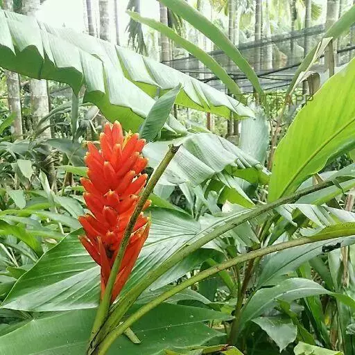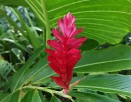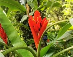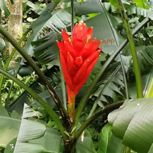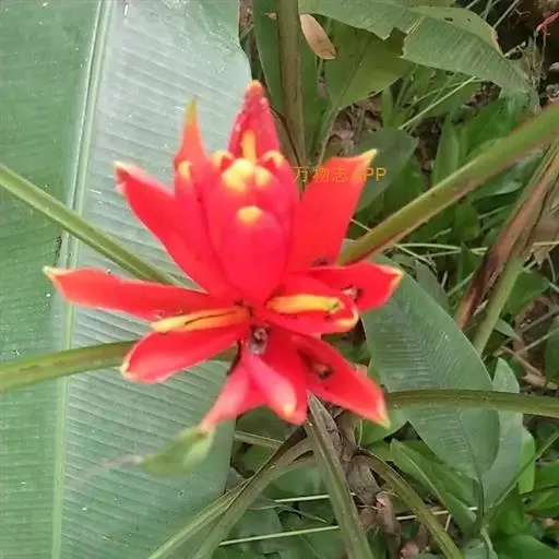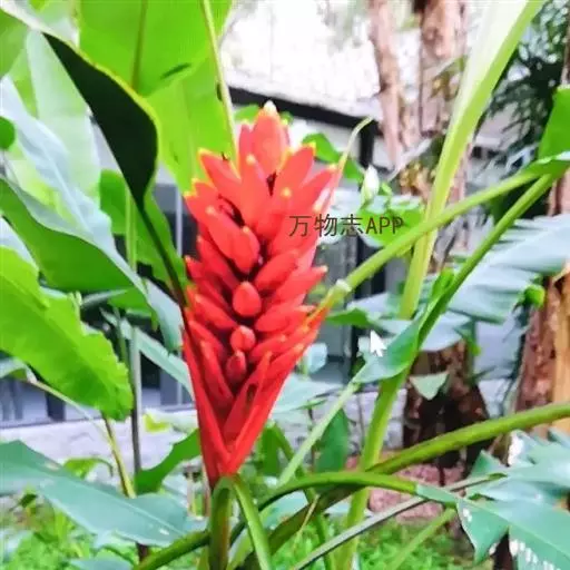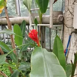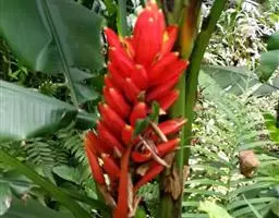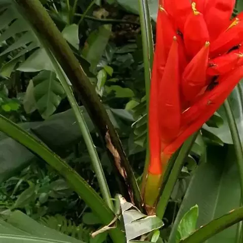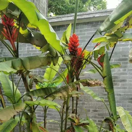 红蕉(学名:Musa coccinea Andr.),假茎高1-2米。叶片长圆形,长1.8-2.2米,宽68-80厘米,叶面黄绿色,叶背淡黄绿色,无白粉,基部显著不相等,浑圆而无耳;叶柄长30-50厘米,有张开的窄翼。花序直立,序轴无毛,苞片外面鲜红而美丽,内面粉红色,皱折明显,每一苞片内有花一列,约6朵;雄花花被片乳黄色,合生花被片具5 (3+2) 齿裂,二侧裂片具角,离生花被片先端尖且具细齿,与合生花被片几等长。浆果果身直,在序轴上斜向下垂,灰白色,无棱,长10-12厘米,直径约4厘米,果柄长3-3.5厘米,果内种子极多。