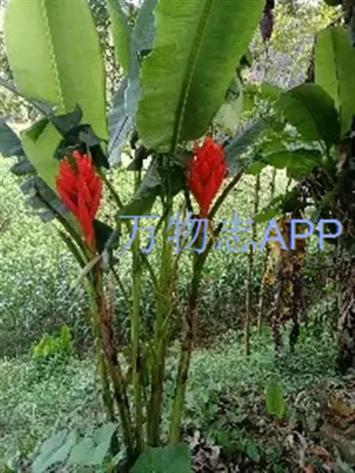 红蕉 假茎高1-2米。叶片长圆形,长1.8-2.2米,宽68-80厘米,叶面黄绿色,叶背淡黄绿色,无白粉,基部显著不相等,浑圆而无耳;叶柄长30-50厘米,有张开的窄翼。