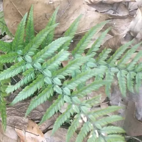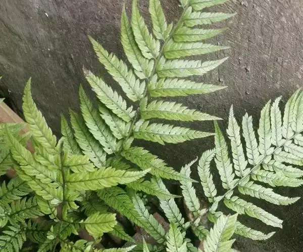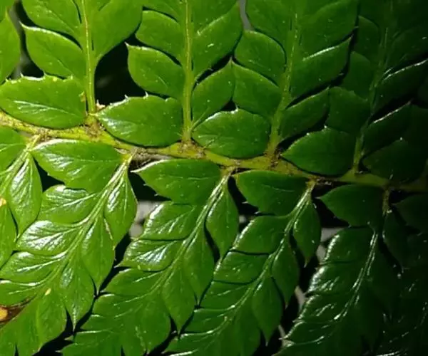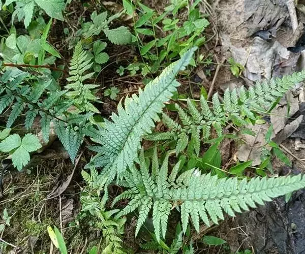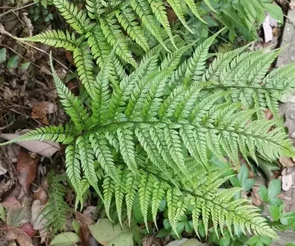 植株高30-60厘米。根茎直立,密被狭卵形深棕色鳞片。叶簇生,叶柄长16-30厘米,基部直径2-4毫米,禾秆色,腹面有纵沟,下部密生披针形及线形黑棕色鳞片,向上部渐成为线形鳞片,鳞片边缘睫毛状;叶片宽披针形或狭卵形,长20-42厘米,宽6-14厘米,先端长渐尖或成尾状,基部圆楔形或截形,二回羽状;羽片20-26对,互生,平展或略斜向上,柄极短,线状披针形,中部的长4-9厘米,宽1-1.5厘米,先端渐尖至尾状,基部偏斜,上侧截形,下侧宽楔形,羽状;小羽片7-13对,互生,略斜向上,密接,柄极短,斜矩圆形,斜的卵形或三角卵形,下部的长5-10毫米,宽4-6毫米,先端急尖或钝,有小刺头,基部斜的宽楔形,上侧有三角形耳状凸,边缘有或长或短的小尖齿;基部上侧第1片增大,卵形或三角卵形,长7-15毫米,宽4-6毫米,有时羽状分裂;小羽片具羽状脉,侧脉常为二叉状,腹面隐没,背面微凹下或微凸起。叶为薄革质,背面疏生纤毛状基部扩大的黄棕色鳞片;叶轴腹面有纵沟,背面密生鳞片,鳞片线形,基部扩大边缘睫毛状,黑棕色间或为棕色。孢子囊群位于小羽片主脉两侧,每个小羽片3-9个;囊群盖圆形,盾状,全缘。