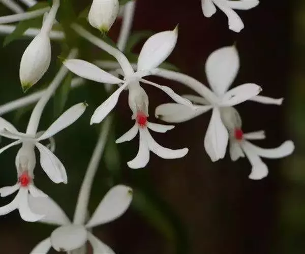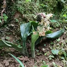 花葶从叶丛中抽出,直立,长达70余厘米;花序柄被2-3枚筒状鞘和数枚苞片状叶,密被短毛;总状花序长5-10厘米,密生许多花;花苞片宿存,草质,向外伸展,卵状披针形,长1-2厘米,基部上方宽5-10毫米,先端急尖,边缘多少波状,被毛或有时近无毛;花梗和子房白色,纤细,斜立,长达4厘米,被短毛;花白色或偶见淡紫红色,后来转为桔黄色;萼片和花瓣常反折,质地较厚,干后变黑色;中萼片近椭圆形,长9-12毫米,中部宽4.5-5.5毫米,先端锐尖或具细尖头,具5条脉,其中中间3条较明显,背面被短毛;侧萼片稍斜的倒卵状披针形,比中萼片稍大,具5条脉,背面被短毛。