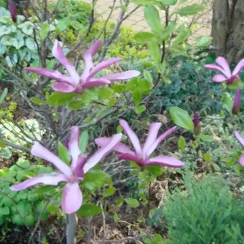 9、星花玉兰(M.stellata)×紫玉兰(M. liliiflora),于美国国家树木园(U.S. National Arboretum),由Francis de Vos和William F. Korsar在培育变种时偶然得到。