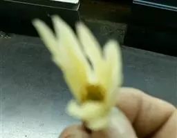 2炒制:取辛夷,除去杂质,取净花蕾,用清炒法,炒至绒毛呈微黑色为度,筛去灰屑。