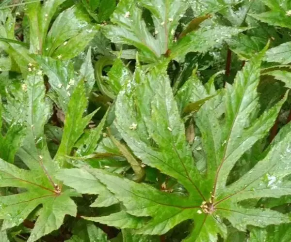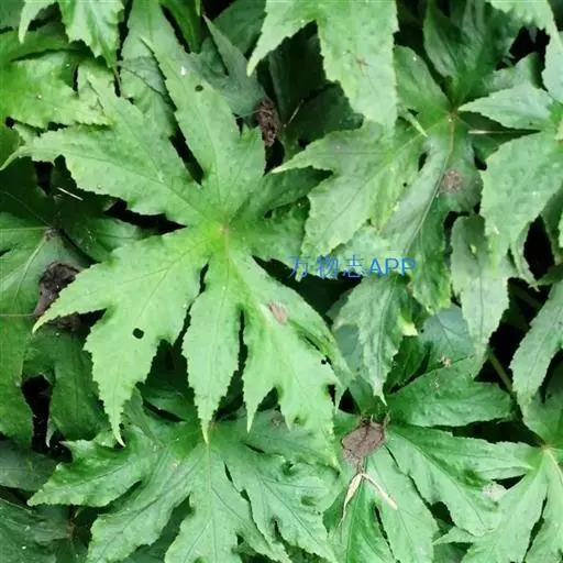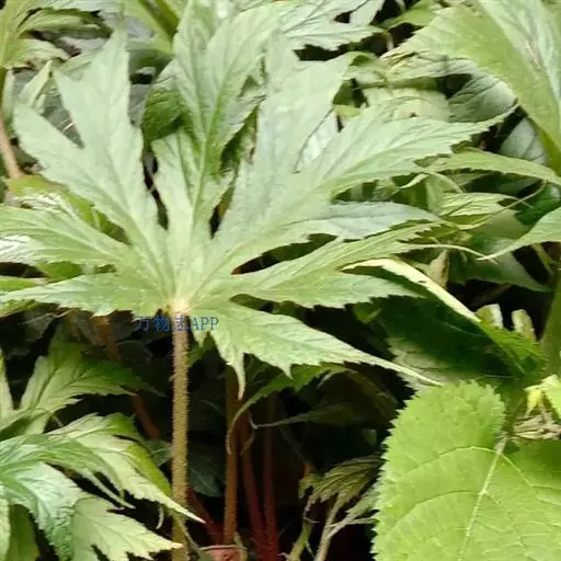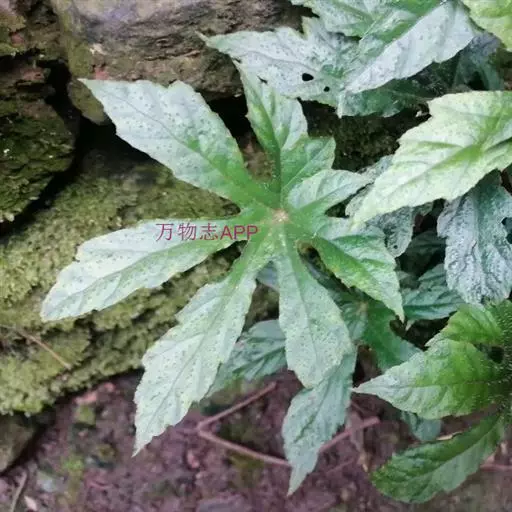 叶均基生,具长柄;叶片轮廓宽卵形至扁圆形,长10-17厘米,基部近截形或微心形,5-6深裂,裂片长圆形至椭圆形,长5-13厘米,先端渐尖,基部楔形,通常不再分裂,两侧裂片较小,边缘常浅裂,裂片三角形,全边具粗而浅不等大之齿,齿尖常带短芒,干时上面褐绿色,散生短硬毛,下面色淡,沿脉散生糙伏毛,毛略不等长,掌状5-6条脉,至分裂处呈羽状脉;叶柄细弱,长8-28厘米,被褐色卷曲长毛,在上部密,以后逐渐减少;托叶卵形,长5-8毫米,宽3-5.5毫米,先端渐尖,顶端带刺毛,全缘,无毛。