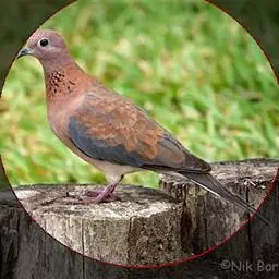 欧斑鸠体长27厘米,是一种体型略小的粉褐色斑鸠。颈侧具多黑白色细纹的斑块,翼覆羽深褐,…