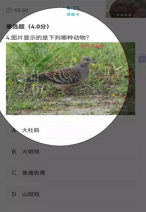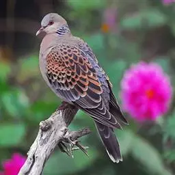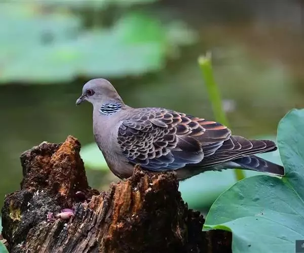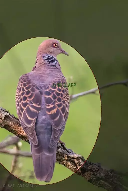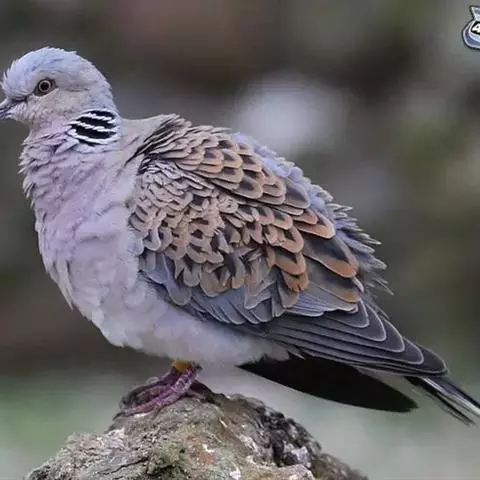 山斑鸠,是鸽形目鸽鸠科斑鸠属鸟类,又名金背斑鸠、棕背斑鸠、山鸠、金背鸠、麒麟斑、麒麟鸠、东方斑鸠、绿斑鸠、山鸽子。山斑鸠颈侧具明显黑白色条纹的块状斑,上体深褐色、具扇贝状斑纹,羽缘棕色,尾羽近黑色,下体多偏粉色。虹膜黄色,喙灰色,脚粉色。山斑鸠是留鸟,在中国常见且分布广泛。此外,还分布于不丹、尼泊尔、巴基斯坦、印度、日本等国。栖息于针阔混交林、季风常绿阔叶林、果园及农耕区,多成对活动于开阔农耕区、村舍、寺院周围及防火林带。取食于地面,主要觅食植物种子、果实、嫩芽等,也吃昆虫。山斑鸠飞翔时鼓翼快速,叫声为反复而低沉的“咕咕咕”声。繁殖期在4-7月,营巢于林中树上,通常一年繁殖2窝,窝卵数2枚,由雌雄亲鸟轮流孵卵,孵化期18~19天。山斑鸠的肉、卵可食,肉入药可益气明目、强筋壮骨,治久病气虚、衰弱无力、两目昏暗等病症。山斑鸠啄食杂草种子,对农田清除杂草有益;但有时也刨食农作物及树的种子。山斑鸠