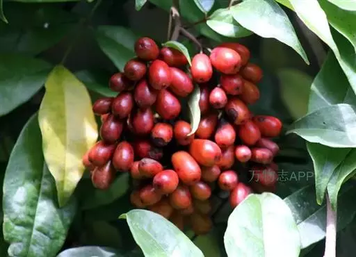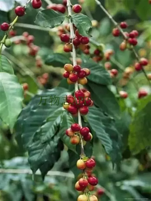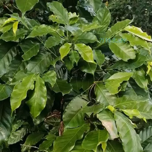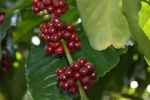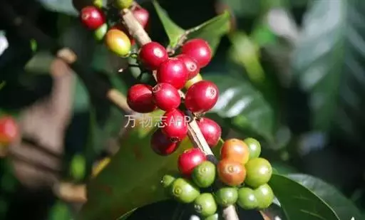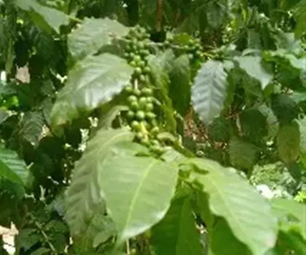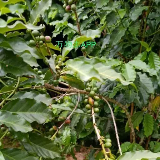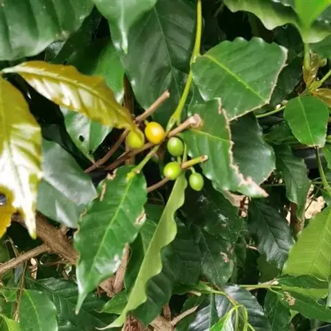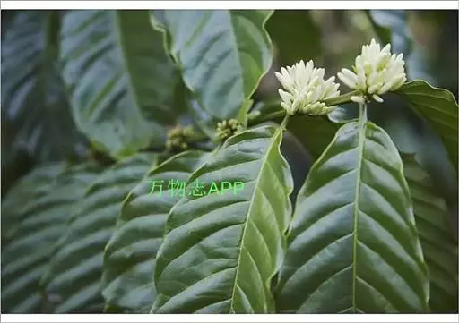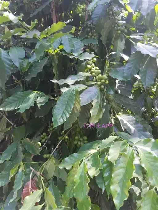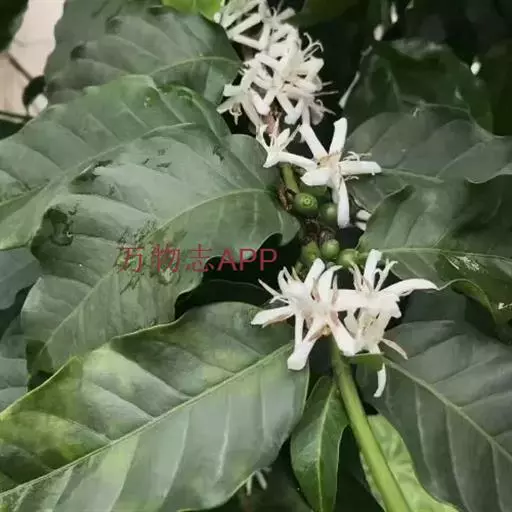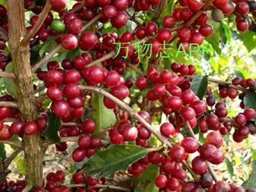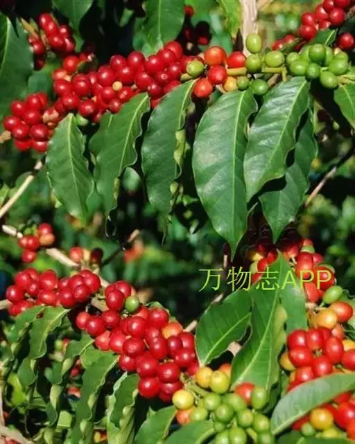 小粒咖啡(Coffea arabica L.)小乔木或大灌木,高5-8米;老枝灰白色,幼枝无毛。叶薄革质,卵状披针形或披针形,两面无毛;叶柄长8-15毫米;托叶阔三角形。聚伞花序数个簇生于叶腋内,每个花序有花2-5朵,无总花梗或具极短总花梗;花芳;萼管管形;花冠白色,裂片常长于花冠管;花药伸出冠管外;花柱长12-14毫米,柱头长3-4毫米。浆果成熟时红色,外果皮硬膜质,中果皮肉质,有甜味;种子背面凸起,腹面平坦,有纵槽。花期3-4月。