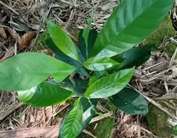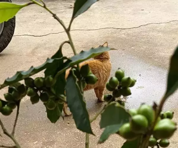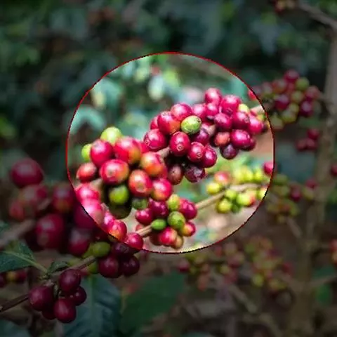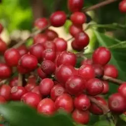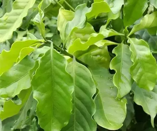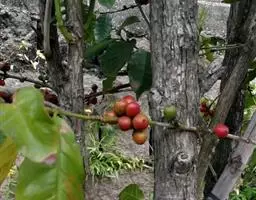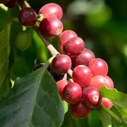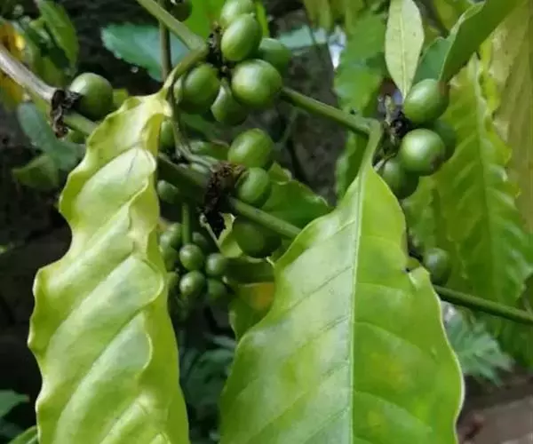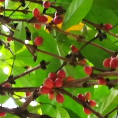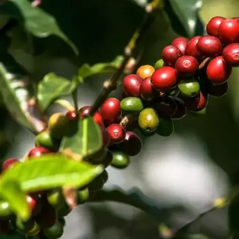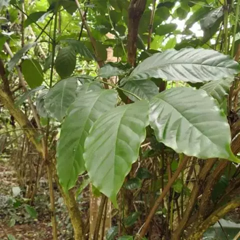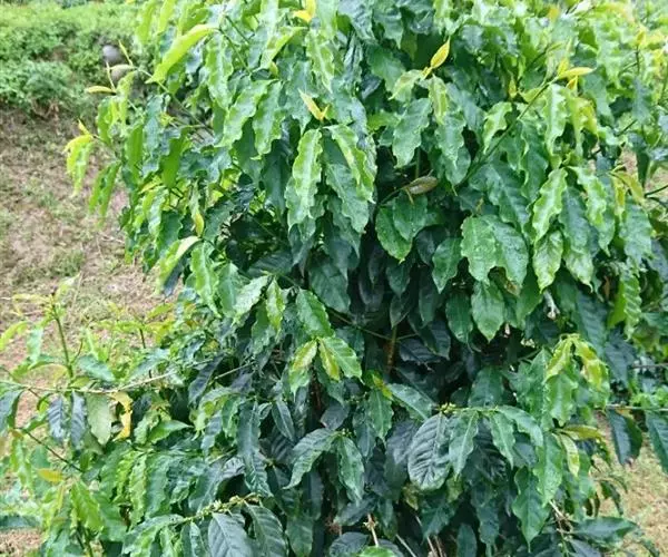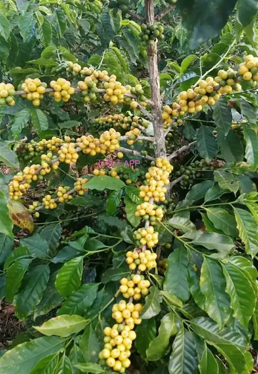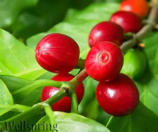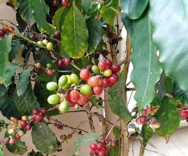 小粒咖啡(Coffea arabica L.)小乔木或大灌木,高5-8米;老枝灰白色,幼枝无毛。叶薄革质,卵状披针形或披针形,两面无毛;叶柄长8-15毫米;托叶阔三角形。聚伞花序数个簇生于叶腋内,每个花序有花2-5朵,无总花梗或具极短总花梗;花芳;萼管管形;花冠白色,裂片常长于花冠管;花药伸出冠管外;花柱长12-14毫米,柱头长3-4毫米。浆果成熟时红色,外果皮硬膜质,中果皮肉质,有甜味;种子背面凸起,腹面平坦,有纵槽。花期3-4月。