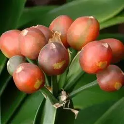 浆果成熟时阔椭圆形,红色,长12-16毫米,直径10-12毫米,外果皮硬膜质,中果皮肉质,有甜味;种子背面凸起,腹面平坦,有纵槽,长8-10毫米,直径5-7毫米。花期3-4月。