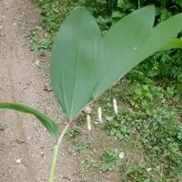 无毛;花每3-7朵簇生,绿白色或淡黄色;花梗长5-7毫米,关节位于上部1/3处;花被片长6-7毫米,下部约1/4-1/5合生成短筒;花丝扁平,宽约0.5毫米,无红棕色疣点;花药长约1.2 毫米;花柱稍短于子房。浆果直径约1厘米。花期7月。