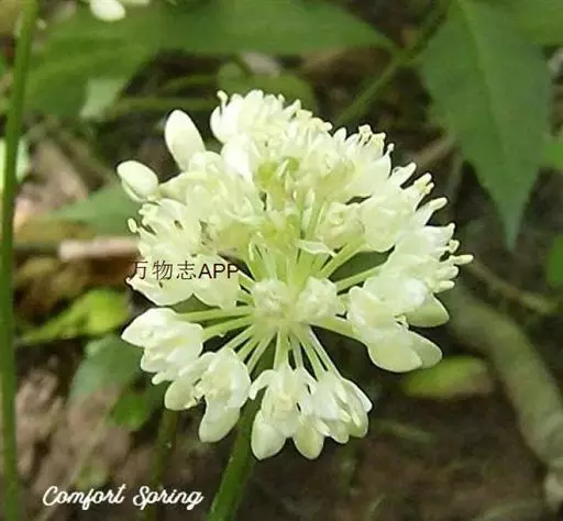 花葶圆柱状,高25-80厘米,1/4-1/2被叶鞘;总苞2裂,宿存;伞形花序球状,具多而密集的花;小花梗近等长,比花被片长2-4倍,果期伸长,基部无小苞片;花白色或带绿色,极稀带红色;内轮花被片椭圆状卵形,长(4.5-)5-6毫米,宽2-3毫米,先端钝圆,常具小齿;外轮的狭而短,舟状,长4-5毫米,宽1.5-2毫米,先端钝圆;花丝比花被片长1/4至1倍,基部合生并与花被片贴生,内轮的狭长三角形,基部宽1-1.5毫米,外轮的锥形,基部比内轮的窄;子房具3圆棱,基部收狭成短柄,柄长约1毫米,每室具1胚珠。花果期6-8月。
