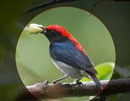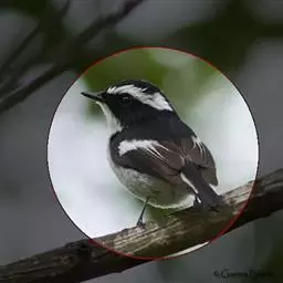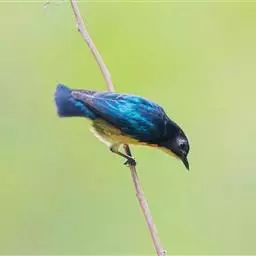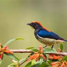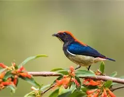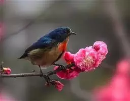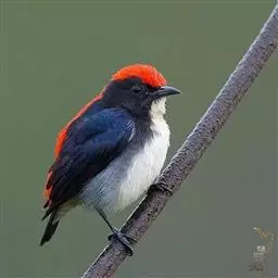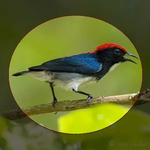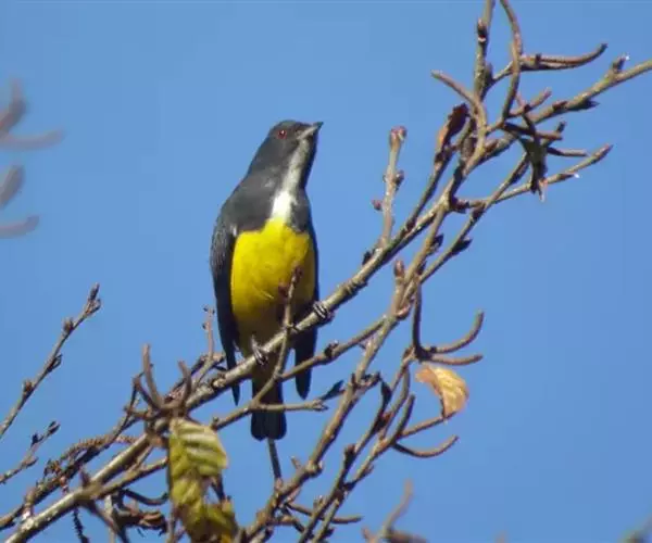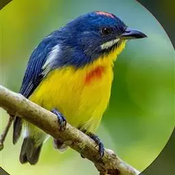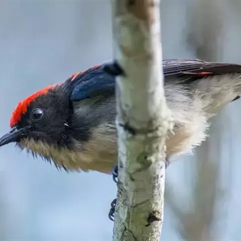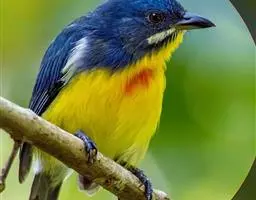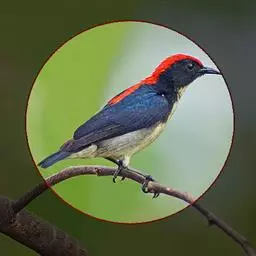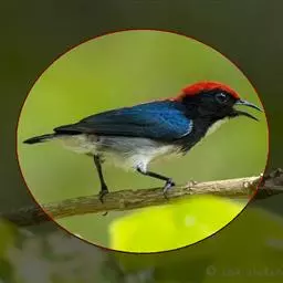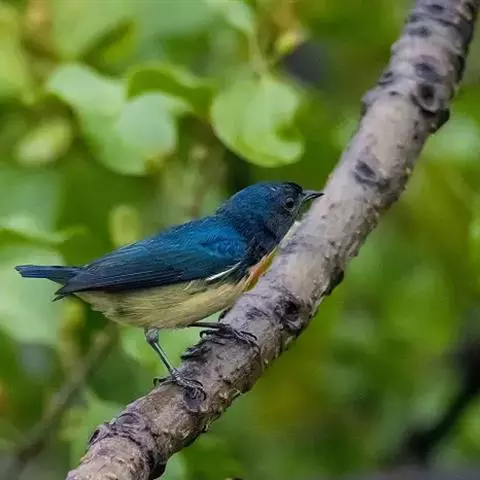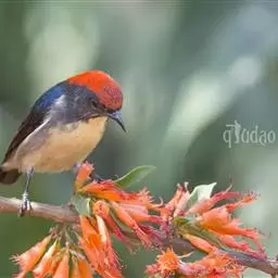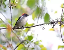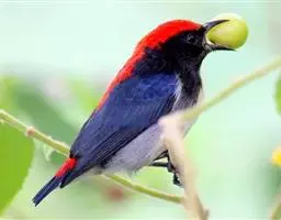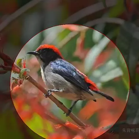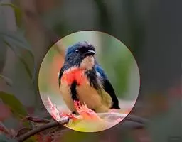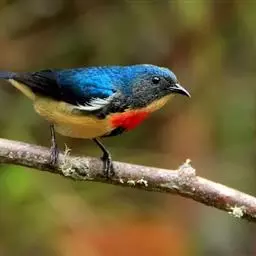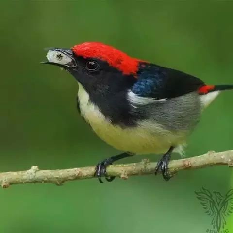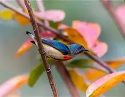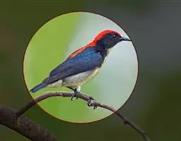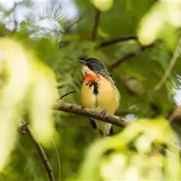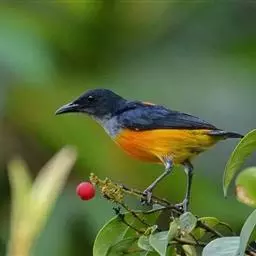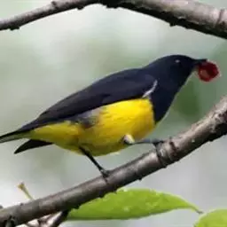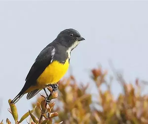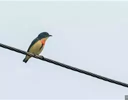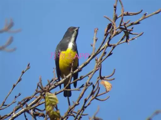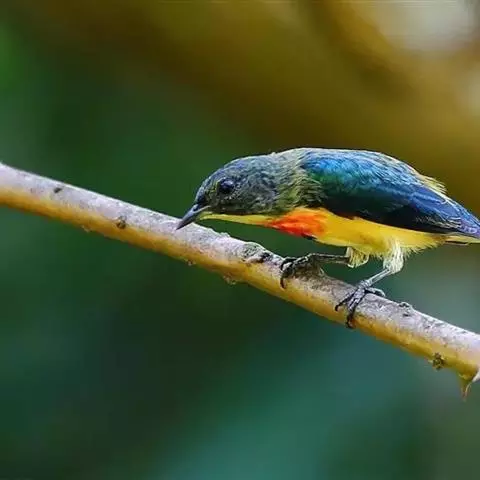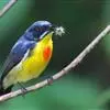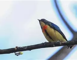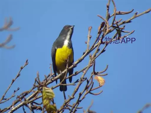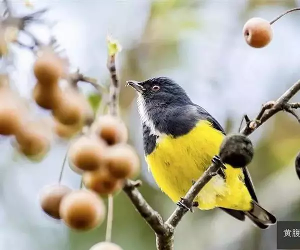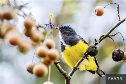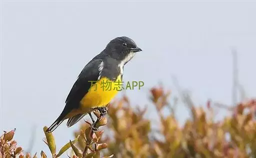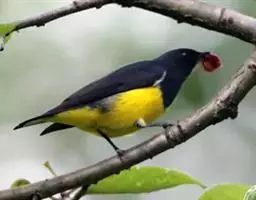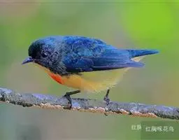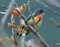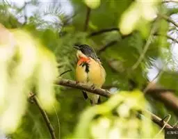 黄腹啄花鸟(学名:Dicaeum melanoxanthum):体重11-16克,体长104-117毫米。是一种体型大,下腹部为艳黄色的啄花鸟,雄鸟特征为头黑色,喉部有白色纵斑、喉侧及上体成对比,两翅和尾黑色,外侧尾羽内翈具白色斑块。其余下体淡黄色。雌鸟似雄鸟但色暗。虹膜褐色,嘴黑色,脚黑色。
