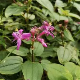 伞状聚伞花序,腋生,总梗长约2毫米至几无,密被小腺点;花梗长约3毫米,密被小腺点;花萼钟状漏斗形,长约4毫米,密被小腺点,钝四棱形,裂片4(-5),广卵形,长约1毫米,具小尖头;花瓣4(-5),白色至粉红色,卵形,顶端渐尖或近急尖,长约4毫米,于右上角突出一小片;雄蕊4(-5),等长,花丝长约4毫米,花药长约4毫米,粉红色,呈曲膝状,药隔微膨大,下延直达花药基部,有时几呈小瘤状;子房坛形,下位,4室,顶端具4个小突起,被疏小腺点。蒴果椭圆形,4裂,为宿存萼所包;宿存萼与果等长,檐部平截,被示腺点。花期6-8月,果期10-12月,有时茎上部开花,下部果熟。