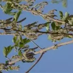 病症特点:当年生幼树上,刚开始在叶、芽、嫩茎上发现灰黄色斑点,之后逐渐扩大,变为褐色或红褐色斑块,或叶面卷曲,严重时造成叶片脱落,嫩茎畸形。