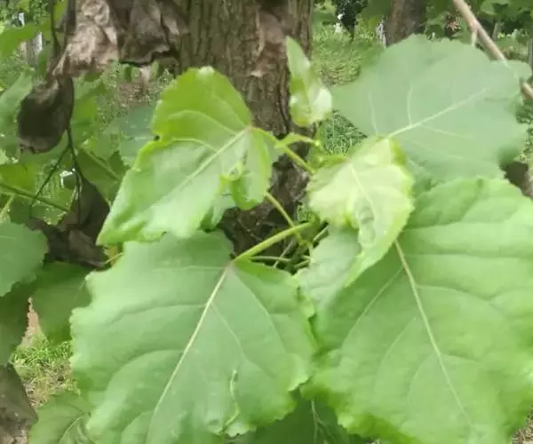 新一代中华红霞杨 大叶杨组,树皮呈片状开裂,粗糙。芽圆锥形,微有粘质,光滑。短枝与长枝叶近圆形,基部心形或深心形;叶柄仅先端微扁。花盘深裂,宿存;雄蕊12-40,花药长椭圆形,具细尖;子房具柔毛,花柱较长,柱头2-3裂。蒴果具毛,2-3(4)瓣裂。