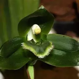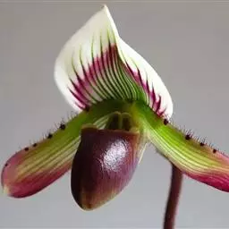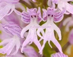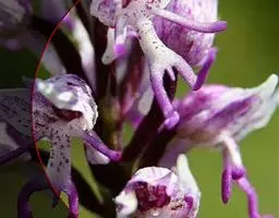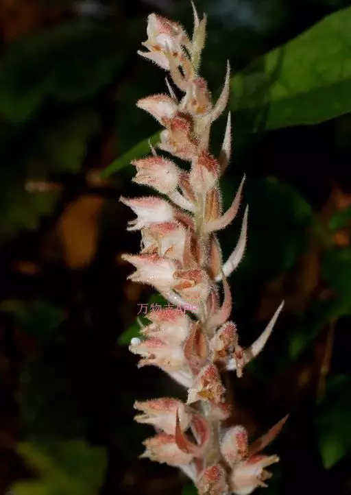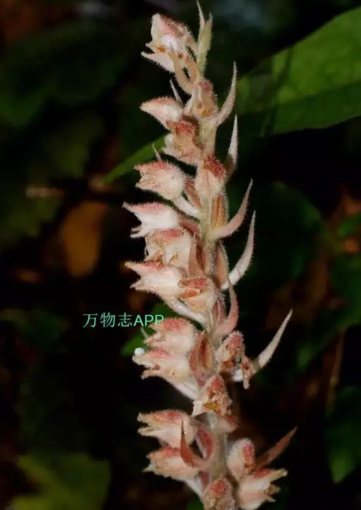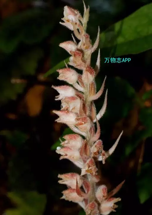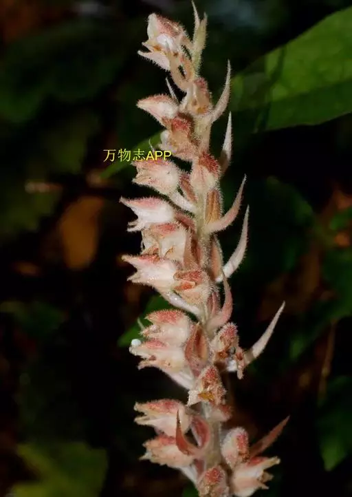 花茎直立,长6-8厘米,被毛;总状花序具几朵至多朵密生而常偏向一侧的花,花序梗极短或长,无或具几枚鞘状苞片;花苞片披针形,长1-1.5厘米,宽2-2.5毫米,背面被毛;子房圆柱形,被毛,连花梗长8-10毫米;花中等大,半张开,白带粉红色、白带淡绿色或近白色;萼片狭卵形,凹陷,长5-8毫米,宽3.5-4毫米,先端钝,具1脉,背面被毛。