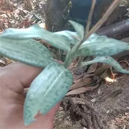 多叶斑叶兰植株高15-25厘米。根状茎伸长,茎状,匍匐,具节。茎直立,长9-17厘米,绿色,具4-6枚叶。叶疏生于茎上或集生于茎的上半部,叶片卵形至长圆形,偏斜,长2.5-7厘米,宽1.6-2.5厘米,绿色,先端急尖,基部楔形或圆形,具柄;叶柄长1-2厘米,基部扩大成抱茎的鞘。