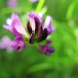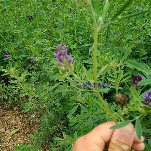 1.紫苜蓿,多年生宿根草本。主根长达2-5m。根茎发达;有蔓茎或无,茎高30-100cm,直立或匍匐,光滑,多分枝,约在15-25枝不等。3出复叶,小叶片倒卵状长圆形,长2-2.5cm,仅上部尖端有锯齿;小叶顶端有中肋突出;叶柄长而平滑;托叶大。花梗由叶腋抽出,花有短柄;8-25朵形成簇状的总状花序;萼钟状,有5齿;花冠紫色。荚果螺旋形,2-3绕不等,稍有毛,黑褐色,不开裂。种子1-8粒,肾形,黄褐色,很小。花期5-6月。
