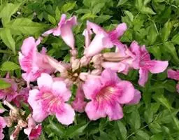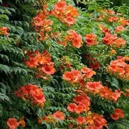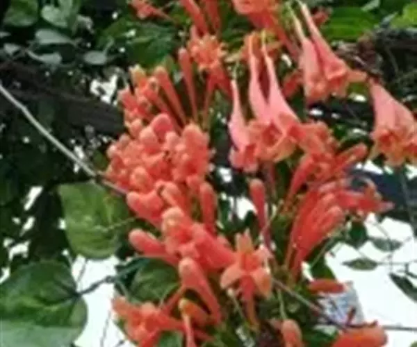 多植于庭园建筑物的四周,攀援于凉棚上,初夏红橙色的花朵累累成串,状如鞭炮,故有炮仗花之称。