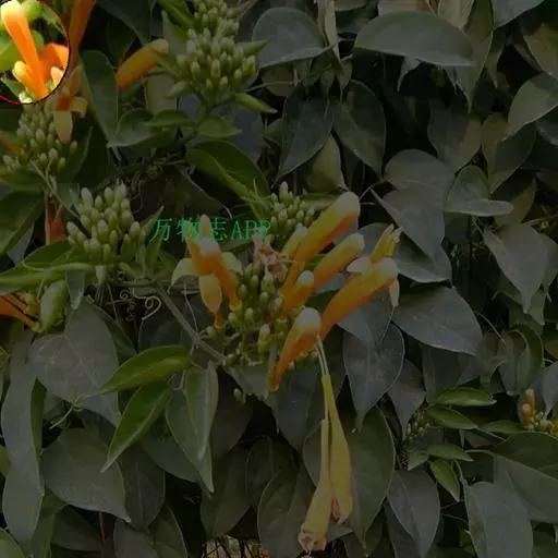 炮仗花,藤本,具有3叉丝状卷须。叶对生;小叶2-3枚,卵形,顶端渐尖,基部近圆形,长4-10厘米,宽3-5厘米,上下两面无毛,下面具有极细小分散的腺穴,全缘;叶轴长约2厘米;小叶柄长5-20毫米。