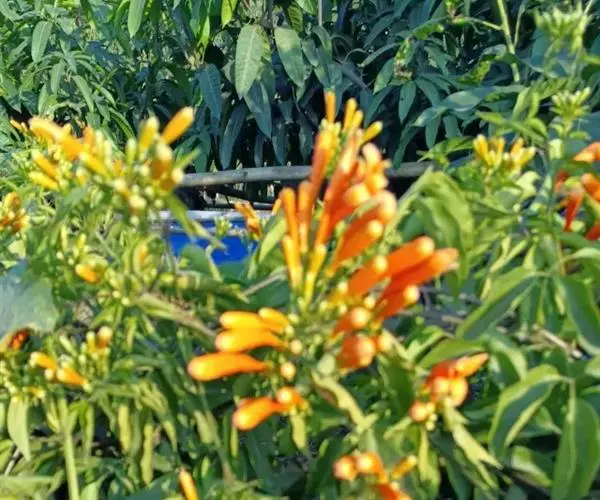 圆锥花序着生于侧枝的顶端,长约10-12厘米。花萼钟状,有5小齿。花冠筒状,内面中部有一毛环,基部收缩,橙红色,裂片5,长椭圆形,花蕾时镊合状排列,花开放后反折,边缘被白色短柔毛。雄蕊着生于花冠筒中部,花丝丝状,花药叉开。子房圆柱形,密被细柔毛,花柱细,柱头舌状扁平,花柱与花丝均伸出花冠筒外。
