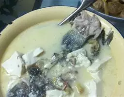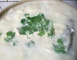 这时候,把缸的盖子盖上,等一会儿,看到豆浆已经成了脑了,里边有一朵一朵的豆腐花,与清水相伴的时候,也就是豆浆分离为豆腐花和清水的时候,就可以压豆腐或是干豆腐了。