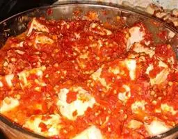 在豆腐花与清水分离以后,就可以做干豆腐了。干豆腐的木框宽要与干豆腐包的宽度一样,长大约一米左右,高大约半米或者一米,先把卷好的干豆腐包放在木框里一层,用豆腐瓢将豆腐花搅搅碎,很均匀的样子,用瓢将豆腐花舀起一些,轻轻地、均匀地泼在豆腐包上,一定要匀,要薄,不能太薄。之后,把豆腐包再续上一层,正好盖住刚才泼的豆腐花上面,又为泼下一层豆腐花做好准备。再重复刚才的程序,泼好第二层豆腐花,再用豆腐包盖住。依此类推,重复进行,直到将干豆腐的木框弄满。