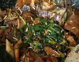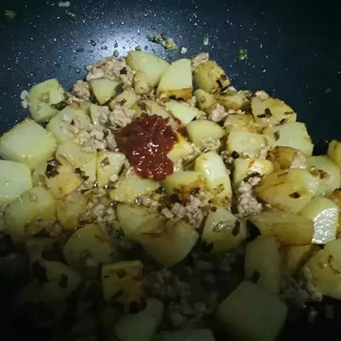 3.加葱姜蒜碎炒香。加糖生抽和胡椒粉调味。