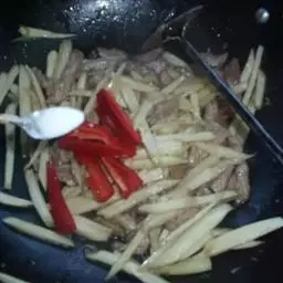 4.接着倒入剁碎的泡椒,加点儿白糖和盐,中火慢慢炒,直到剁椒香味出来。