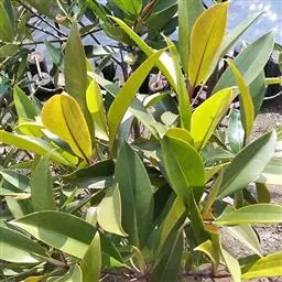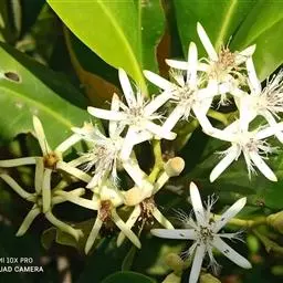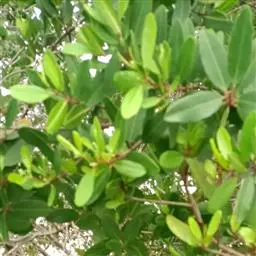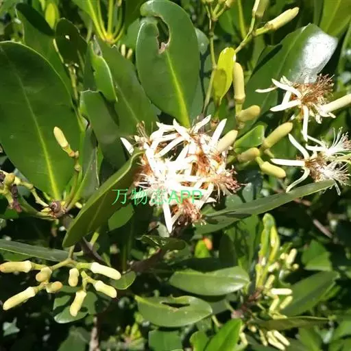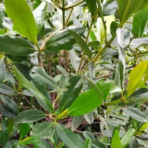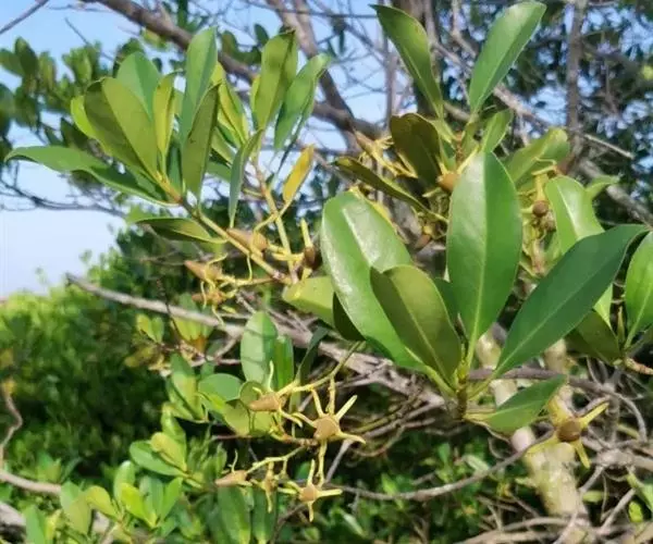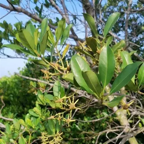 秋茄树(学名:Kandelia candel (L.) Druce)是红树科,秋茄树属灌木或小乔木,高可达3米;树皮红褐色;枝粗壮,有膨大的节。叶片椭圆形、矩圆状椭圆形或近倒卵形,叶脉不明显;托叶早落,有花,花具短梗,花萼裂片革质,花后外反;花瓣白色,膜质,雄蕊无定数,长短不一,花柱丝状,与雄蕊等长。果实圆锥形,胚轴细长,几乎全年开花结果。
