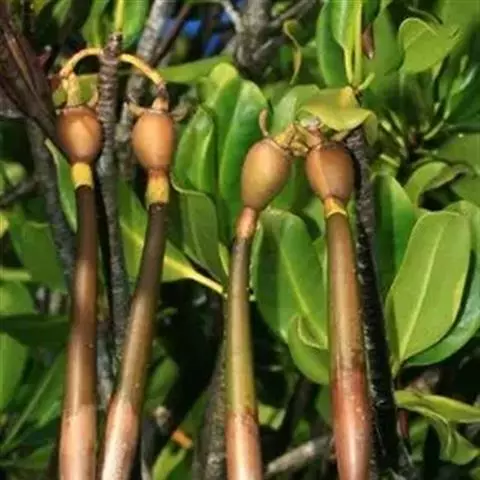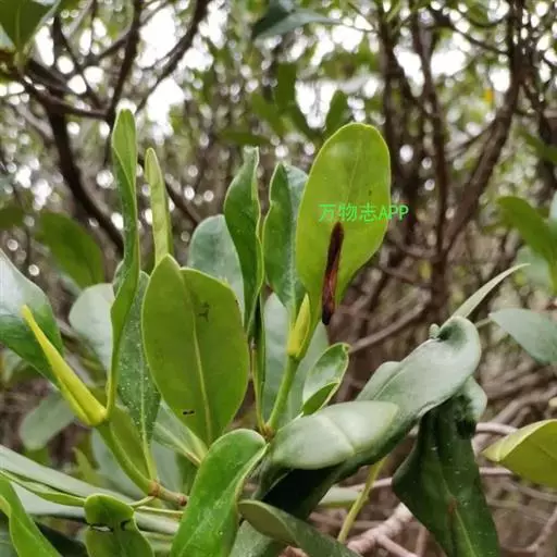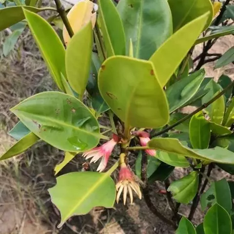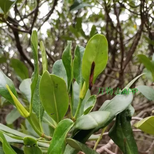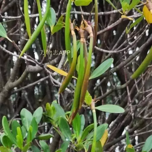 灌木或小乔木,高2-3米;树皮平滑,红褐色;枝粗壮,有膨大的节。叶椭圆形、矩圆状椭圆形或近倒卵形,长5-9厘米,宽2.5-4厘米,顶端钝形或浑圆,基部阔楔形,全缘,叶脉不明显;叶柄粗壮,长1-1.5厘米;托叶早落,长1.5-2厘米。二歧聚伞花序,有花4(-9)朵;总花梗长短不一,1-3个着生上部叶腋,长2-4厘米;花具短梗,盛开时长1-2厘米,直径2-2.5厘米;花萼裂片革质,长1-1.5厘米,宽1.5-2毫米,短尖,花后外反;花瓣白色,膜质,短于花萼裂片;雄蕊无定数,长短不一,长6-12毫米;花柱丝状,与雄蕊等长。果实圆锥形,长1.5-2厘米,基部直径8-10毫米;胚轴细长,长12-20厘米。花果期几乎全年。 “胎生”植物:秋茄树