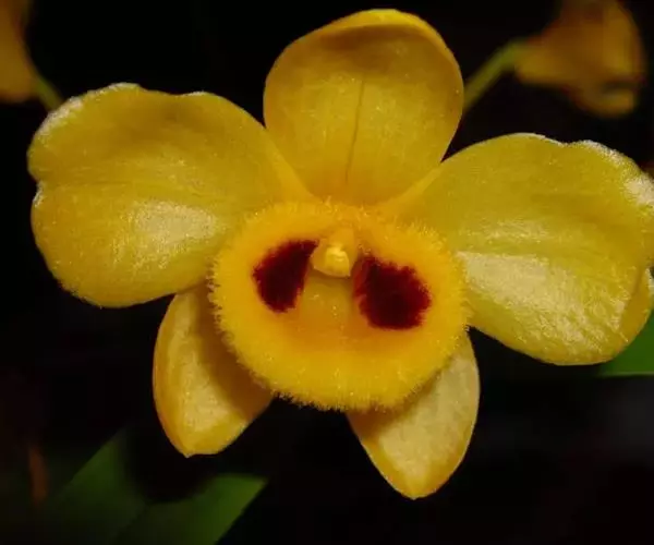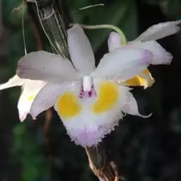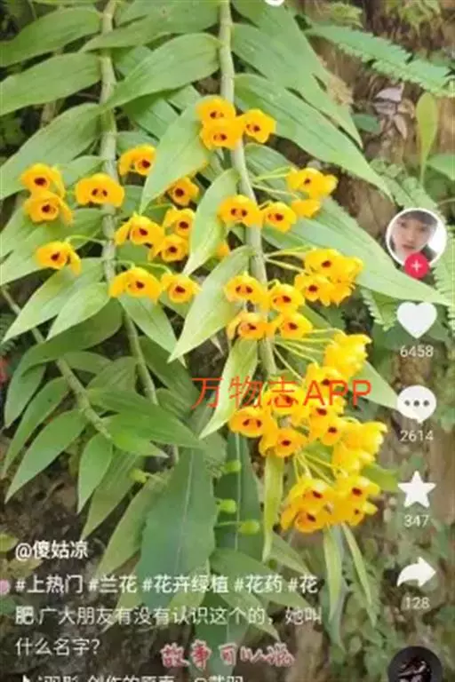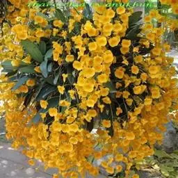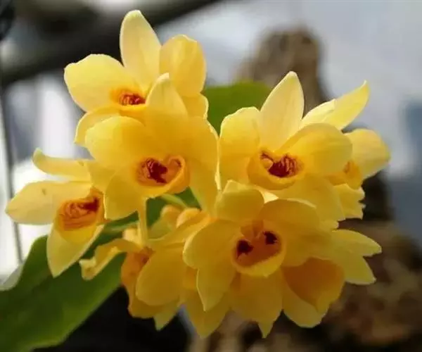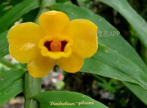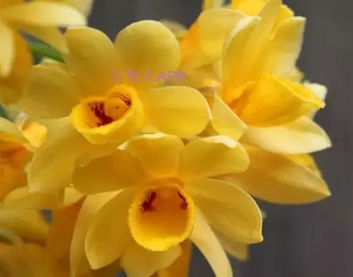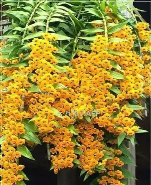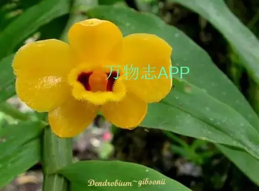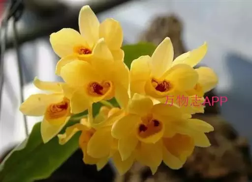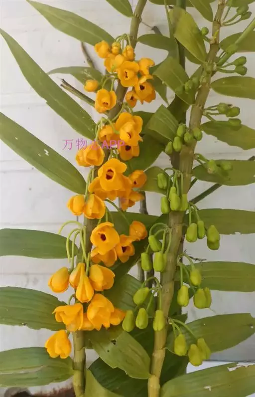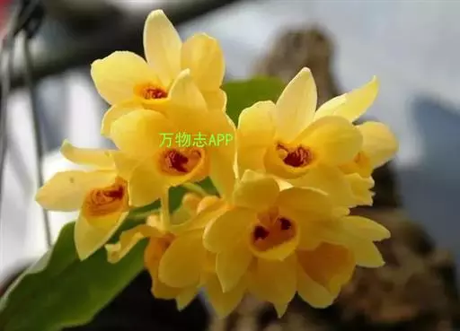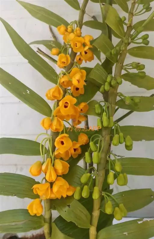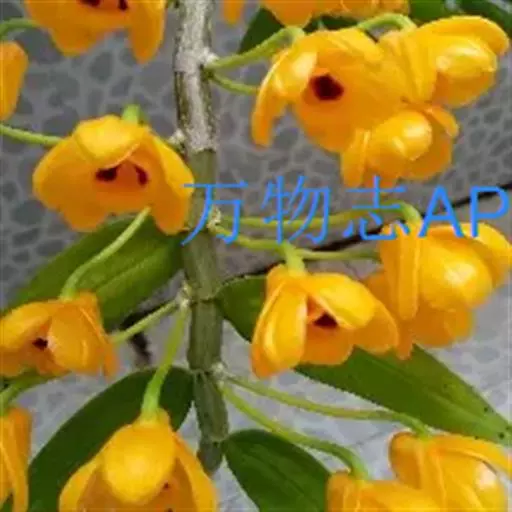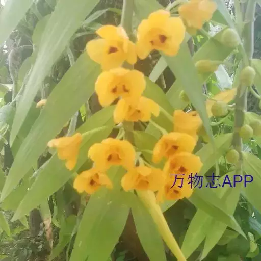 束花石斛(学名:Dendrobium chrysanthum Lindl.):茎粗厚,肉质,下垂或弯垂,圆柱形,不分枝,具多节。叶二列,互生于整个茎上,纸质,长圆状披针形。伞状花序近无花序柄,每2-6花为一束,侧生于具叶的茎上部;花黄色,质地厚;花瓣稍凹的倒卵形,长16-22毫米,宽11-14毫米,先端圆形,全缘或有时具细啮蚀状,具7条脉;唇瓣凹的,不裂,肾形或横长圆形。蒴果长圆柱形,花期9-10月。
