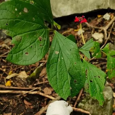 亚灌木,全体无毛。茎高1.5米,当年生小枝草质,小枝基部具数枚鳞片 。叶为二回三出复叶;叶片轮廓为宽卵形或卵形,长15~20厘米,羽状分裂,裂片披针形至长圆状披针形,宽0.7~2厘米;叶柄长4~8.5厘米。花2~5朵,生枝顶和叶腋,直径6~8厘米;苞片3~4(~6),披针形,大小不等;萼片3~4,宽卵形,大小不等;花瓣9(~12),红色、红紫色,倒卵形,长3~4厘米,宽1.5~2.5厘米;雄蕊长0.8~1.2厘米,花丝长5~7毫米,干时紫色;花盘肉质,包住心皮基部,顶端裂片三角形或钝圆;心皮2~5,无毛。瞢葖长约3~3.5厘米,直径1.2~2厘米。花期5月;果期7~8月。