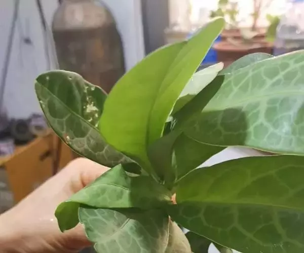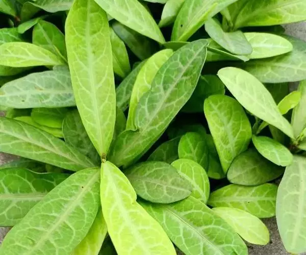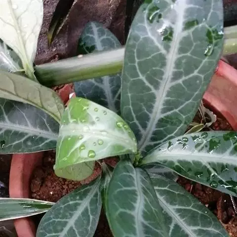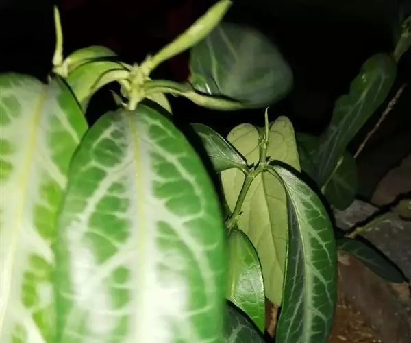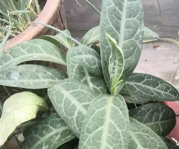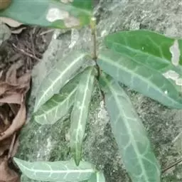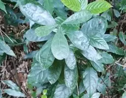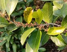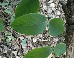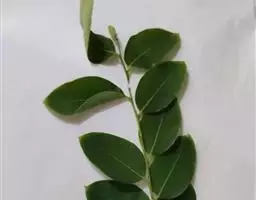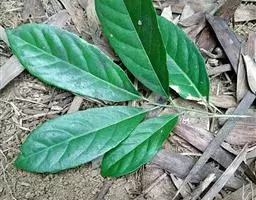 叶通常聚生于小枝上部,常向下弯垂,叶片鲜时近肉质,干后近革质或厚纸质,匙形、倒卵状长圆形或卵形,有时长圆形,长4.5-16.5厘米,宽2.5-6.3厘米,顶端浑圆或钝,有小凸尖,稀凹缺,基部楔形或钝,稀圆形,上面鲜时深绿色,叶脉处呈灰白色,干时黄白色,通常无毛,有时下面基部有腺状短柔毛,后变无毛;中脉和侧脉在鲜叶时扁平,干后中脉两面均凸起,侧脉每边6-9条,下面稍凸起;叶柄长2-5毫米,初时被腺状短柔毛,老渐无毛;托叶三角状耳形,着生于叶柄基部两侧,长4-8毫米,基部宽3-4毫米,宿存。