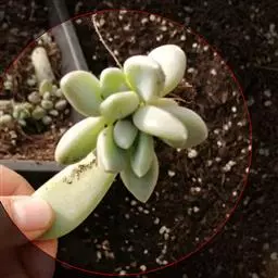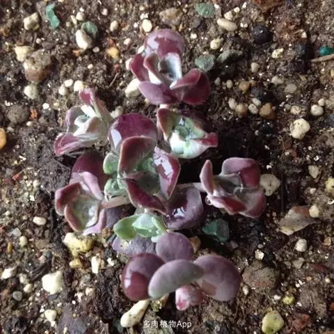 小型多肉品种。有茎,叶互生,排列成莲座状,匙形,表面光洁,正面平坦,背面隆起,肉质厚实,翠绿色,或嫩绿色,叶面上被白粉,有纵向暗纹,并透出密布的极细微的白色颗粒,犹如凝冻的脂肪,经充足的阳光照射,叶尖会出现美丽可爱的小红点。常从茎的下部生出新芽,形成群生状。春季开出成簇小花,白色,花药紫色。据说植株经太阳晒过后,会散发淡淡的香味,故有人叫它“香石莲”。