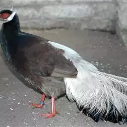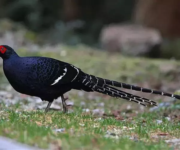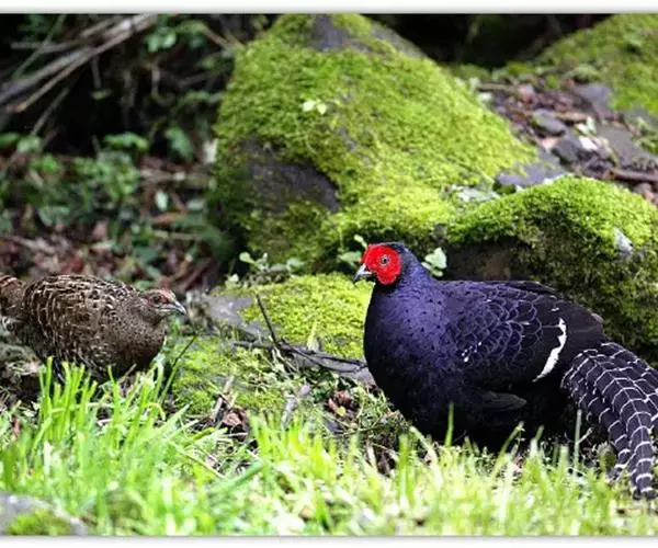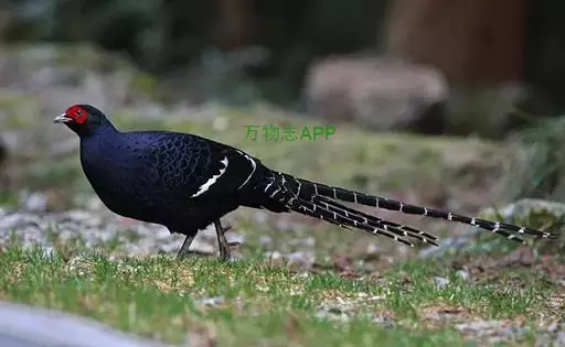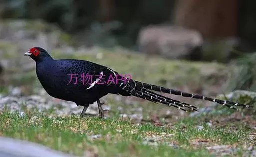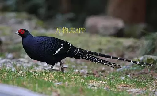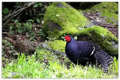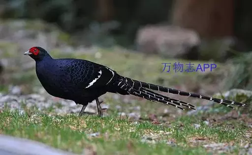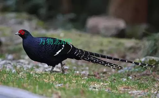 黑长尾雉(学名:Syrmaticus mikado)大型鸡类,体长53~88厘米。雄较雌大。雄鸟通体紫蓝色,脸鲜红色,翅上有一条显著的白色翅斑,尾甚长,黑色,具显著的白色横斑,脚绿褐色。雌鸟通体橄榄褐色,脸红色,背和翅满布棕褐色斑纹和灰白色羽缘,脚绿褐色,尾棕栗色,具黑色横斑。相似种蓝鹇脚鲜红色,雄鸟上背和中央尾羽白色,头具白色冠羽;雌鸟上下体均无白斑,腹具“V”字形暗褐色斑,脚亦为鲜红色,区别均甚明显,野外容易辨识。
