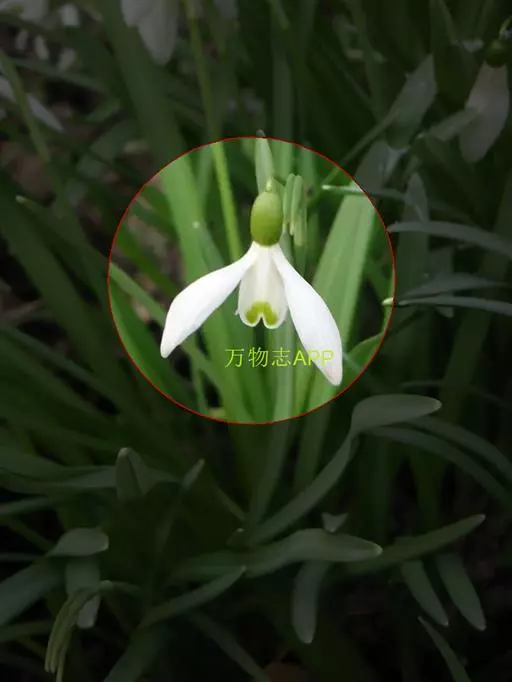 鳞茎卵圆形,直径2.5-3.5厘米。基生叶数枚,绿色,宽线形,长30-50厘米,宽1-1.5厘米,钝头。花茎与基生叶同时抽出,中空,略高于叶或与叶近等长;伞形花序有花3至数朵,有时仅1朵,下有佛焰苞状总苞片1枚,长3-4厘米,宽5-10毫米;花梗长短不一,长者约有5厘米,短者仅1-2厘米;花下垂;花被片长约1.5厘米,白色,顶端有绿点;雄蕊长约为花被片的一半;子房下位,长椭圆形,长5-10毫米;花柱长于雄蕊。蒴果近球形,直径约2厘米;种子黑色。花期春季。