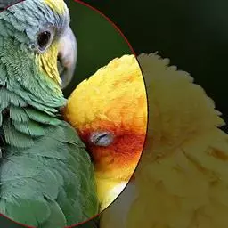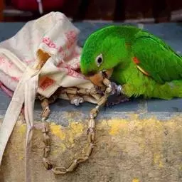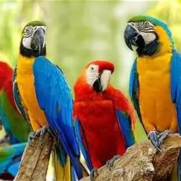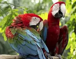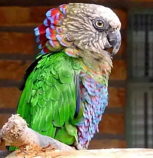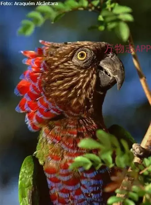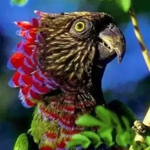 鹰头鹦鹉(学名:Deroptyus accipitrinus):鹰头鹦鹉体长35厘米,体重190-277克。额头和顶冠具柔和的白色,眼先深褐色,枕部和头部两侧有棕色羽毛,并具有柔软的白色条纹, 后颈有长长的暗红色羽毛并镶有蓝边,有2个亚种,是典型的攀禽,鸟喙强劲有力,喙钩曲,上颌具有可活动关节,喙基部具有腊膜。肌肉质舌厚。脚短,强大,对趾型,两趾向前两趾向后,适合抓握和攀援生活。羽毛。晚成雏。是非常独特与美丽的南美洲鹦鹉,也是唯一会把整个颈部以上的冠羽如伞蜥蜴般扩展开的鹦鹉,看起来很像印地安人的羽冠,头部与胸腹部羽色鲜艳美丽,神情起来份外像老鹰,极为特别。