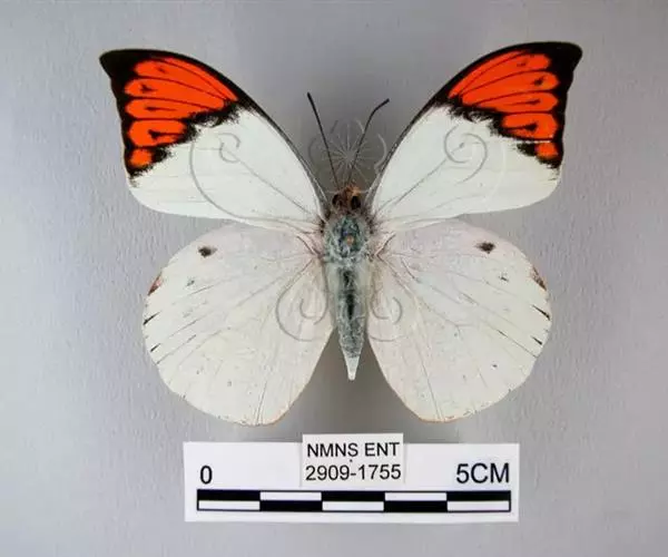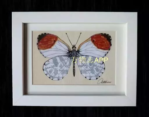 成虫:雄蝶翅白色,前翅前缘及外缘黑色,自前缘1/2处至外缘近后角处有黑色锯齿状斜纹,围住顶部三角形赤橙色斑,斑被黑色脉纹分割;室内有1列黑色箭头纹;后翅外缘脉端有黑箭头纹。雌蝶黄白色,散布有黑色鳞粉,后翅外缘、亚缘各有1列明显的黑色箭头纹。反面前翅端半部和整个后翅满布褐色细纹。春型个体小,翅稍尖。