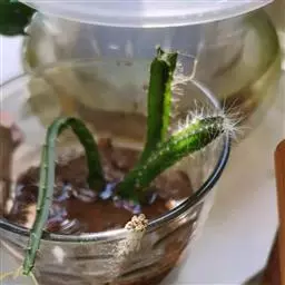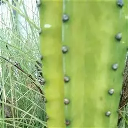 用利刀在霸王花的三棱柱适当高度横切一刀,然后将三个棱峰作30-40度切削,用消过毒的仙人刺刺入砧木中间维管束,将切平的接穗连接在刺的另一端,用刺将接穗和砧木连接起来,砧木和接穗尽量贴紧不留空隙,避免细菌感染不利愈合,然后在两旁各加一刺固定,再用细线绕基部捆紧。